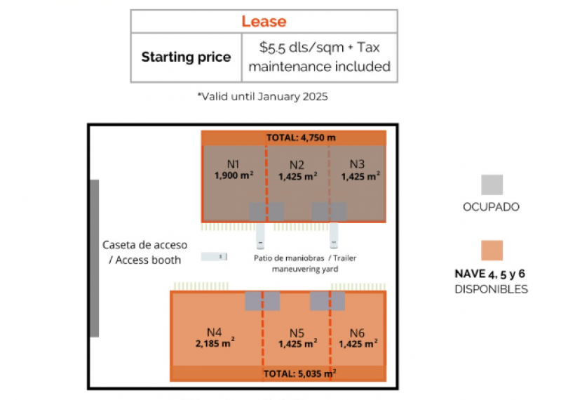 SPECTACULAR INDUSTRIAL BUILDING FOR LEASE WITHIN ONE OF THE MOST IMPORTANT PARKS IN SAN LUIS POTOSI, SAN LUIS POTOSI, MEXICO. My price is in dollars (USD). I have an incredible location, with a guardhouse and all the services to install your company with all the facilities, the park is located within the industrial zone of San Luis Potosi. In the building you have 7 KVAS of available energy, fire protection system, ventilation, water and gas, the building has an asking price of $5.50 USD per m2 with the building's current specifications including maintenance. Also the building can be equipped with any extra features and needs with a extra cost. COME TO KNOW ME, I AM THE STRATEGIC LOCATION TO INSTALL YOUR COMPANY!!! TAXES NOT INCLUDED. AVAILABILITY AND PRICE SUBJECT TO CHANGE WITHOUT PRIOR NOTICE.